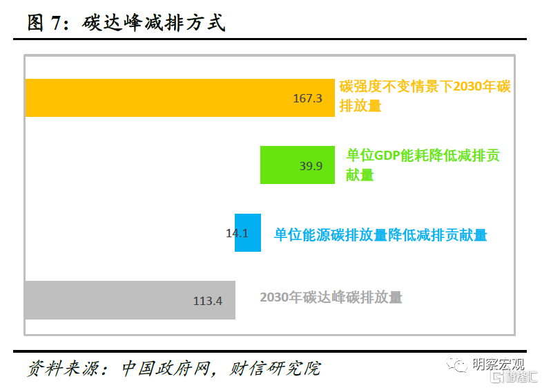 分减排方式看,主要通过提高能源使用效率与降低单位能源碳排放量完成。若保持当前碳排放强度不变,到2030年每年碳排放量将达到167.3亿吨,完成碳达峰目标需减排63.9亿吨。减排具体方式,一方面来自能源使用效率的提高,即降低单位GDP能耗(能源强度)。根据“十四五”规划纲要,到2025年“单位GDP能耗降低13.5%”,结合当前能源效率提升趋势,预计到2030年单位GDP能耗将降低23.8%,能减排39.9亿吨。另一方面来自单位能源碳排放量降低等其他方式,贡献剩余14.1亿吨减排量(见图7)。
