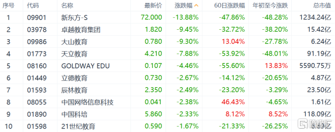 三大教育巨头市值一夜之间累积蒸发了570亿元人民币。同时,K12教育和留学辅导机构朴新教育跌超22%、少儿英语培训机构51Talk跌近20%。