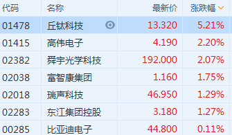 港股异动 | 苹果概念股走强 丘钛科技(1478.HK)涨超5%