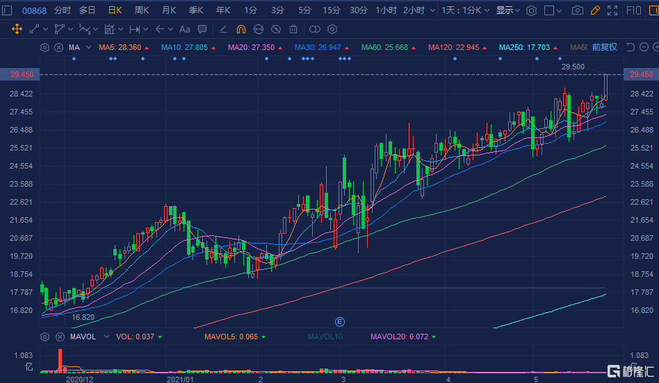 格隆汇5月26日丨信义玻璃(0868.HK)拉升涨近6%,报29.5港元再创历史新高,总市值近1200亿港元。