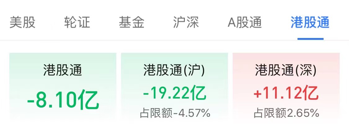 港股通(南向)净流出8.10亿港元,其中,港股通(沪)净流出19.22亿港元,港股通(深)净流入11.12亿港元。