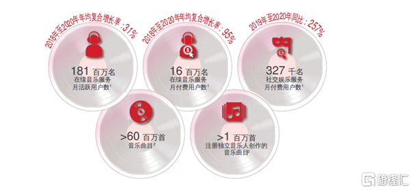 截至2020年底,在线音乐服务MAU达1.81亿,增长率为23.1%。在线音乐付费用户1600万,增长率达85.3%。