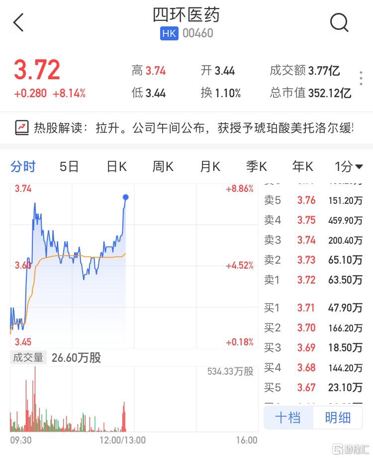 港股异动 | 四环医药(0460.HK)涨超8% 获授予琥珀酸美托洛尔缓释片中国大陆独家推广权