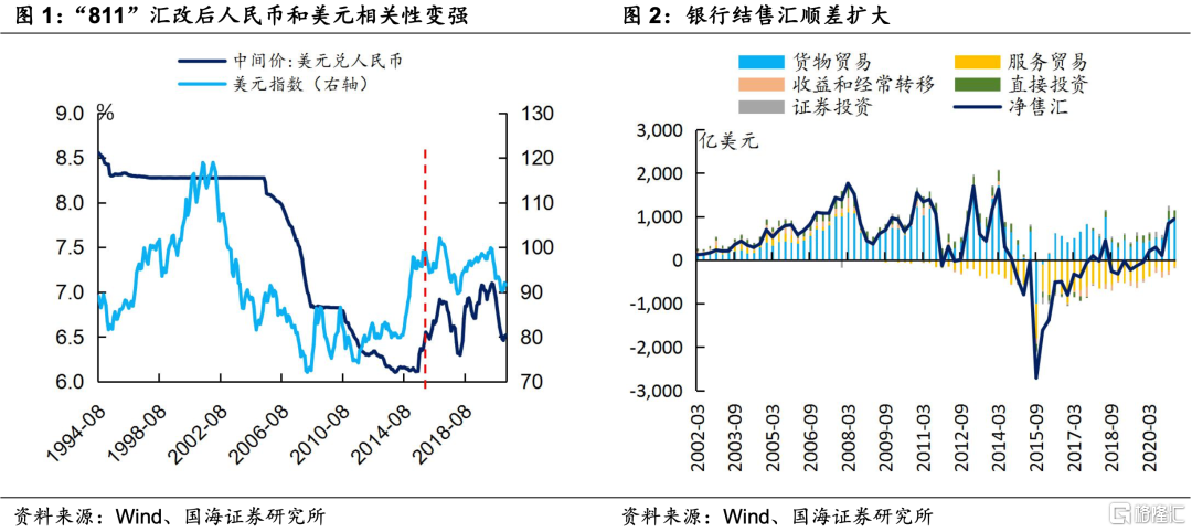 (1)疫情以来,美元指数持续走弱。疫情后,美国先后通过了三轮大规模刺激法案,并且通过货币化的方式来应对不断走高的赤字问题。在此格局下,美元存在贬值压力。“811”汇改后,人民币汇率的市场形成机制得到了进一步加强,与美元指数走势越发正相关。因此,疫情以来,美元指数的贬值是人民币升值的基础。