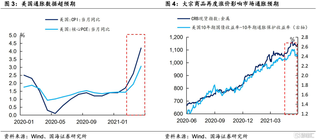 一方面,3-4月份美国通胀数据大幅抬升,引发了市场的担忧。美国4月份CPI同比增速已经冲上了4.60%,而作为美联储货币政策执行目标的核心PCE也已经达到了3.06%,均高于美联储所制订的长期平均2%目标,远超市场预期。