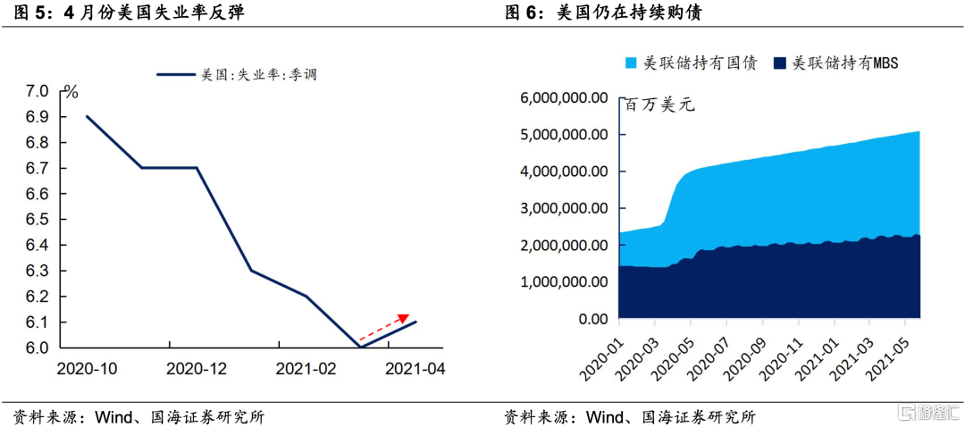 美联储继续维持鸽派态度,也使得美元阶段性走弱。我们在前期报告《通胀超预期,美联储将如何应对?》中曾指出,相较通胀数据,本轮美联储更关心就业数据。因此,即使4月份通胀超预期高走,但是由于失业率数据超预期反弹,美联储依旧维持鸽派的态度。