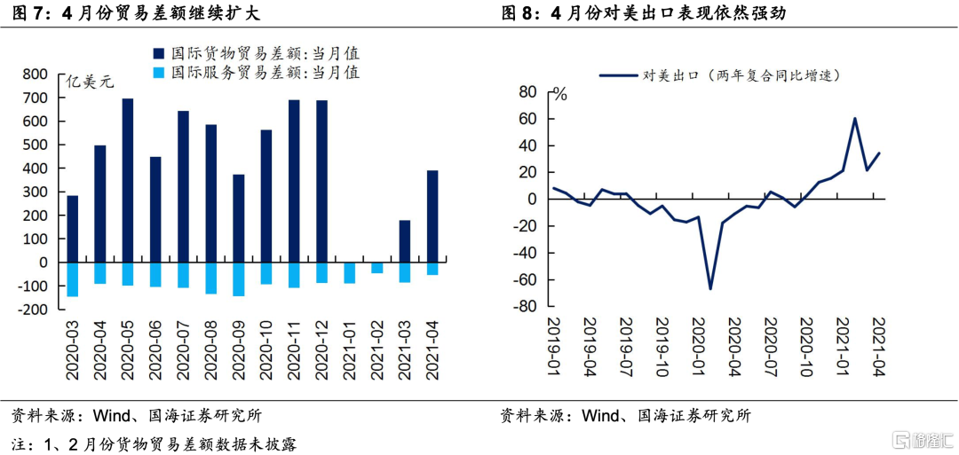 4月份贸易顺差继续扩大对人民币升值有一定支撑。而造成这种现象的原因主要在于:(1)以美国为代表的海外需求依旧不弱;(2)海外疫情反弹,中国产能替代效应消退减缓。