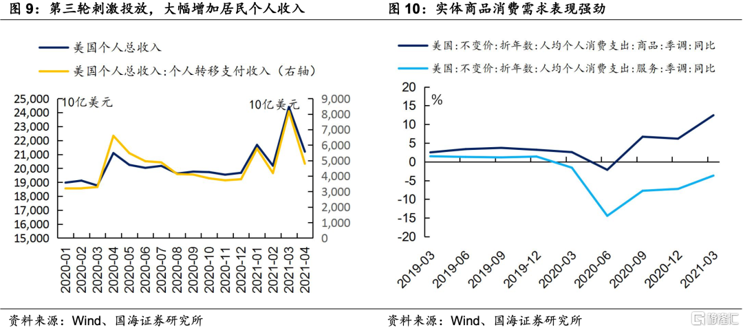一季度以来,以美国为代表的海外需求依旧不弱,是贸易顺差能够继续扩大的原因之一。美国第三轮刺激法案投放后,居民个人收入再一次得到提升。与此同时,海外疫情仍有散发,因此,美国在服务消费需求上的恢复依旧较慢,在此背景下,商品消费需求得到进一步支撑,进而使得中国出口表现不弱,扩大贸易顺差。