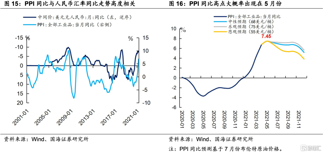 在《中美通胀分析合集》中,我们曾提出通过布伦特原油期货合约来预测PPI同比走势的方法。根据我们的模型,本轮PPI同比增速大概率出现在5月份。展望未来,随着PPI同比增速开始逐渐回落,人民币汇率也将承压。因此,我们认为,短期内,不宜高估人民币的升值空间。