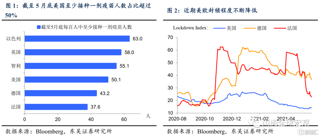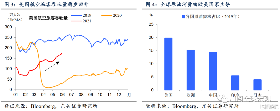 当前油价的上涨正越来越受益于需求的回升。随着各国疫苗接种持续推进,截至5月30日美国至少接种一剂疫苗人数占比超过50%,德国、法国这一比例也分别达43%、38%(图1)。这一进展使得欧美明显放松了封锁限制(图2),美国航空旅客吞吐量近期创下疫情以来新高(图3)。由于发达国家为全球原油需求的主要支撑(占比35%)(图4),因此预计油价接下来仍将受益于美欧进一步解封带来的需求释放。