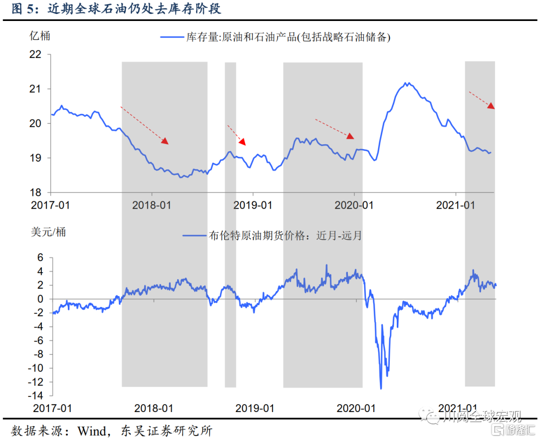 短期内供给恢复的偏缓慢也利好油价。今年以来产油国一直在平衡需求复苏预期和伊朗供应可能增加的前景,因此在伊朗核协议全面恢复前,很可能维持现有的逐步放松石油供应限制的步伐不变。这也就意味着原油市场因“贴水”而持续去库存的局面不会改变(图5)。