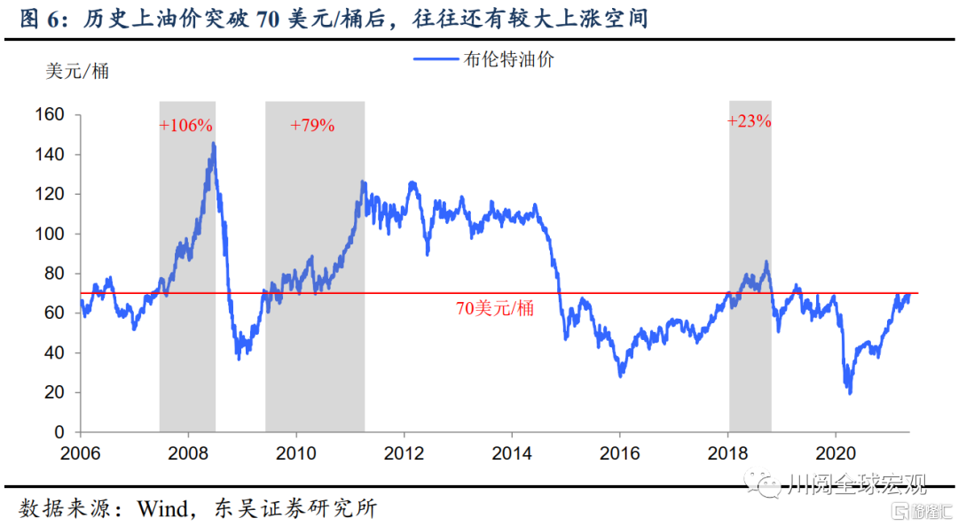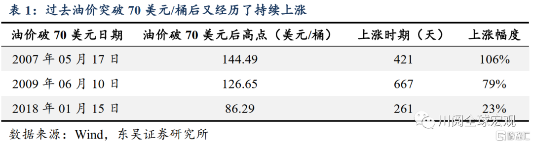 从历史来看,油价突破70美元后仍会延续上涨态势。原油作为风险资产本身波动性较大,市场一旦出现油价利好信号,其上涨往往容易超出预期。我们复盘了21世纪以来油价三次突破70美元/桶后的走势,发现油价在突破70美元/桶后经历较长时期的上涨(9-22个月),且涨幅达23%-106%(图6、表1)。