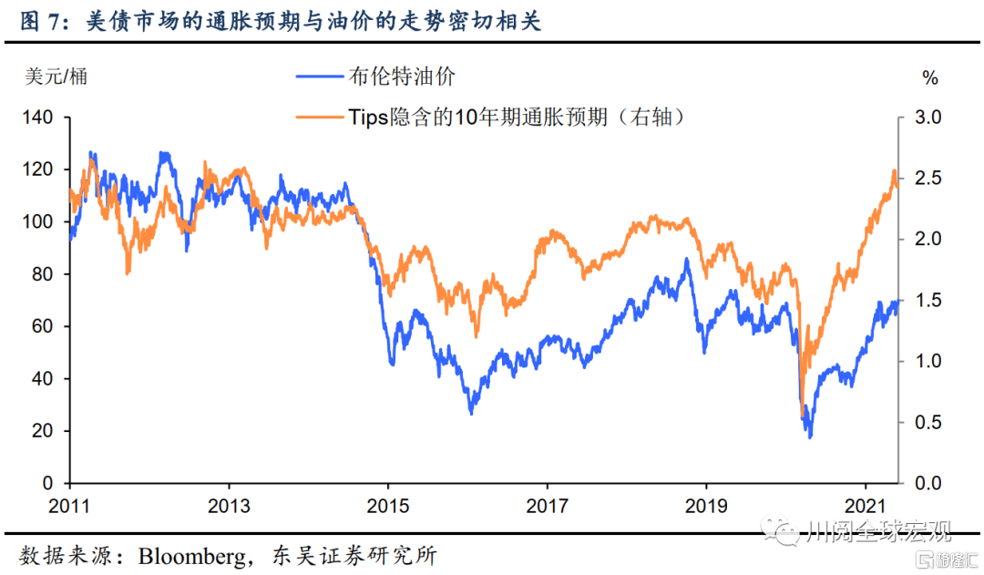 一是市场通胀预期的进一步回升。如图7所示,市场对于美国的通胀预期与油价的走势密切相关。因此,油价在70美元的水平进一步上行,将带动市场的通胀预期进一步升温,鉴于美联储已明确表示其未来的货币政策调整更关注通胀预期的变化,如果未来美债市场的10年期盈亏平衡率突破2.6%,即金融危机后的高点,无疑是值得担忧的。
