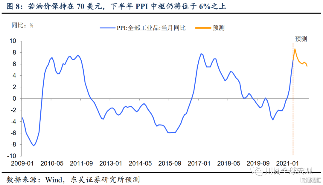 如果油价保持在70美元以上,将抬升下半年中国PPI中枢。油价是我国PPI的重要影响因素。如果油价持续站上70美元,我们的预测模型显示中国PPI的高点在5月突破8%之后,下半年中枢仍将位于6%之上(图8)。