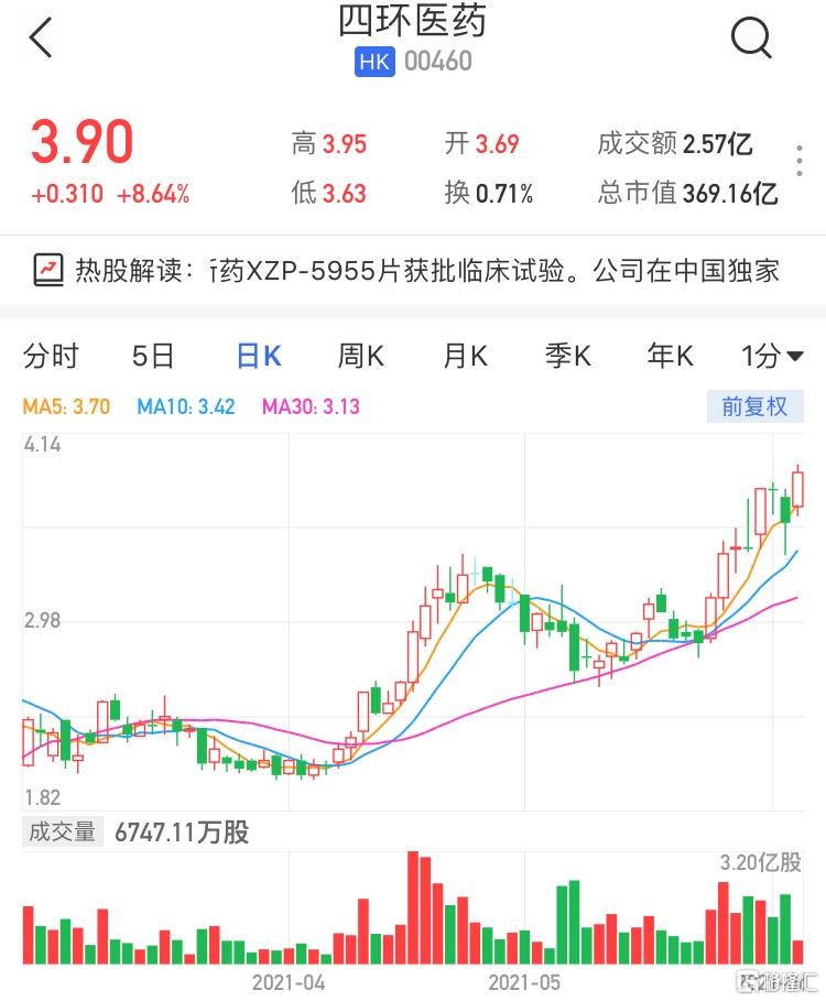 格隆汇6月3日丨四环医药(0460.HK)高开高走,现报3.9港元,涨8.64%,暂成交2亿港元,最新市值369亿港元。四环医药今日早间公布,公司附属公司轩竹生物科技有限公司自主研发的1类新药XZP-5955片于2021年5月31日获得药物临床试验批准通知书,成为集团2021年1月继XZP-5610获得临床试验批准后又一个获批开展临床试验的创新药物。四环医药昨日午间亦公布,该集团将于中国地区独家代理引进韩国东方医疗株式会社(韩国东方医疗会社)旗下的爱拉丝提面部埋植线(线雕)和私密用线两类产品。