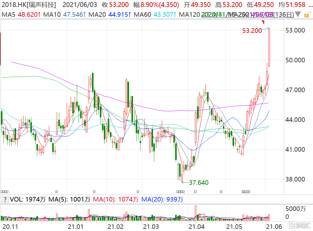 瑞声科技(2018.HK)持续上涨创9个月新高 较前低反弹超40%