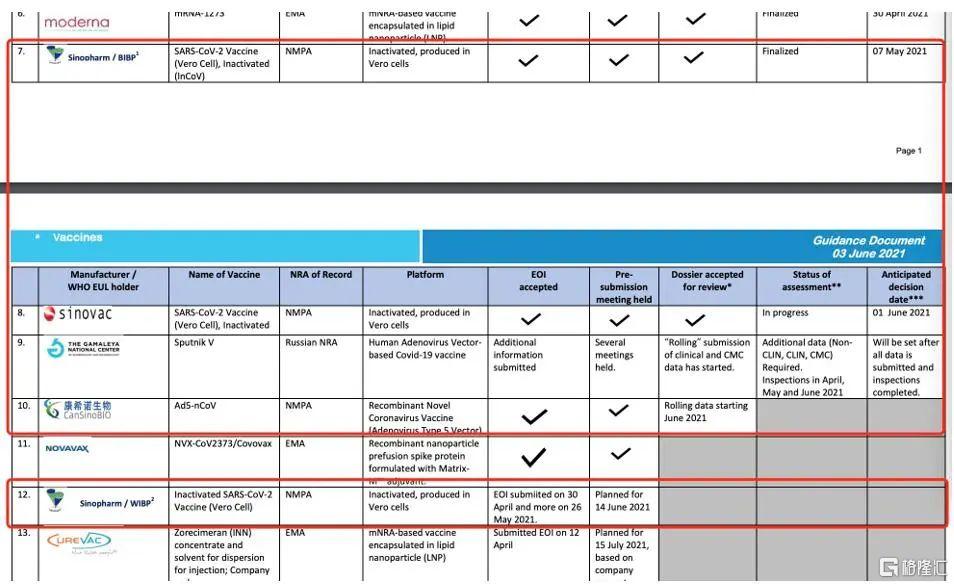 图为世卫组织对几款国产疫苗的审批进度,来自世卫组织官方网站