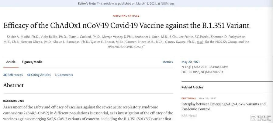 5月20日,《新英格兰医学杂志》上发表了一项研究,称阿斯利康/牛津研发的腺病毒载体疫苗,对感染南非变异毒株的轻中度患者“无保护效力”。