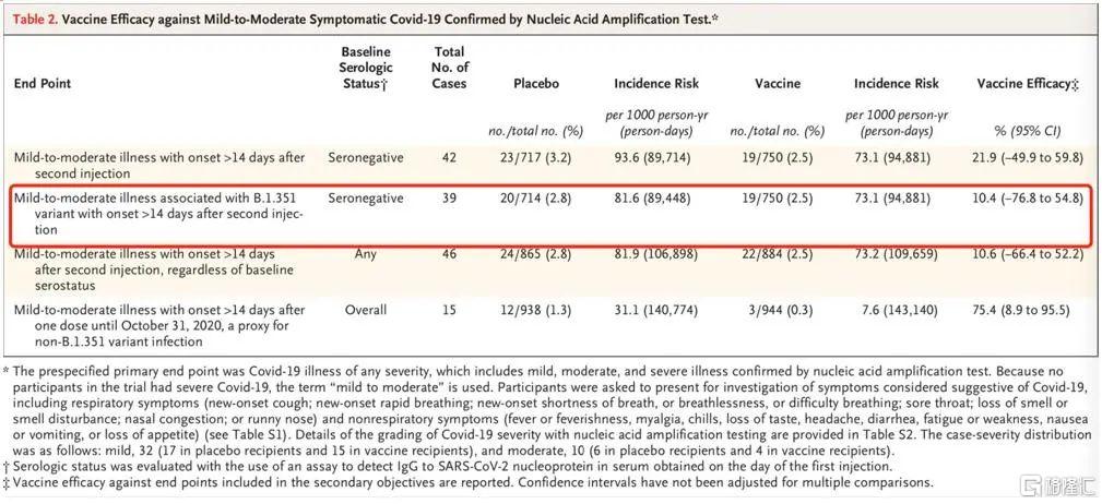 伪病毒和活病毒中和试验显示,与安慰剂接受者的样本相比,疫苗接受者的血清样本对南非变异毒株的抵抗力更强。但是,在主要终点分析中,717名安慰剂接受者中的23人(3.2%)和750名疫苗接受者中的19人(2.5%)出现了轻度至中度新冠肺炎。在这42名新冠肺炎患者中,39例都是由南非变异毒株引起的;作为次要终点分析,针对南非变异毒株的疫苗疗效仅为10.4%。
