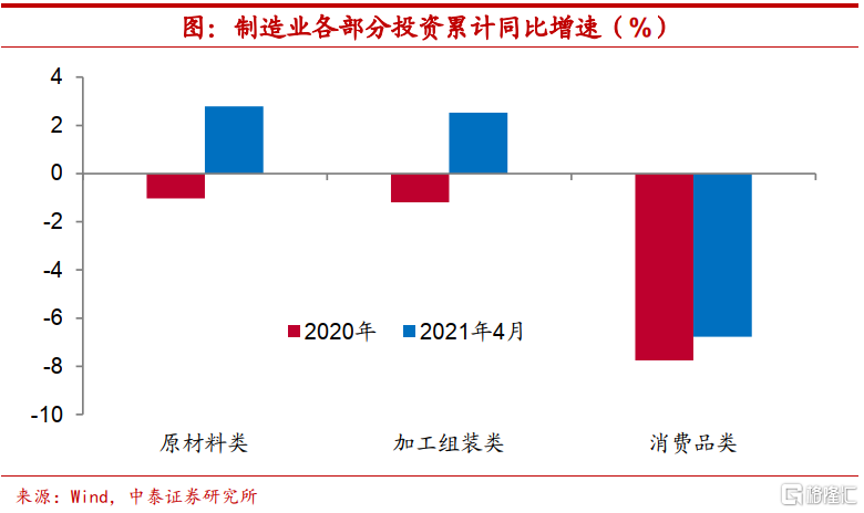 制造业投资也靠消费回暖。事实上,制造业投资也将受益于消费的改善。从制造业各行业投资增速来看,今年前四个月原材料类和加工组装类行业投资增速均录得正增长,而消费品制造类行业投资增速跌幅仍在5%以上,相比于去年改善程度有限,成为拖累制造业投资的主因,消费需求的回暖无疑会带动企业的投资意愿。