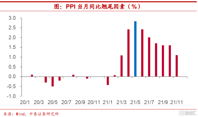 今年以来大宗商品价格涨幅突出,受前期海外疫情抬头和国内整治供给影响,价格一度冲高。而全球疫情见顶回落叠加国常会部署“保供稳价”,使得定价主线重归需求。在年内地产和基建投资乏力的情况下,大宗商品很难被国内需求所消化,工业品价格快速上行期应已接近尾声,PPI同比翘尾因素也逐渐走低,通胀压力趋于缓和。需求缺少强刺激使得上游涨价向下游传导或也并不顺畅。