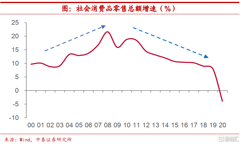 需求走低制约价格。从根本上来说,之所以上游价格上涨愈发难以向下游有效传导,主要在于需求端的变化。从消费增速上来看,2000年-2011年处于震荡上行期,2011年社会消费品零售总额增速仍超过18%,而2012年消费增速较2011年下降4个百分点,自此消费增长开始拐头向下,2018年以来甚至降至个位数增长。虽然我们认为下半年消费增速趋于上行,但更多地是来自疫情后的修复,缺少较强政策刺激下不足以显著推升CPI增速。