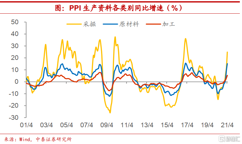 生产资料行业,涨幅依次递减。从工业行业内部来看,提供生产资料的各行业价格传导相对较为顺畅,而价格涨幅从上游到下游依次递减。如今年4月采掘工业PPI同比增速接近25%,原材料工业PPI同比超过15%,加工工业PPI同比增速只有5.4%,近几轮工业品价格上涨时期情况也基本类似。