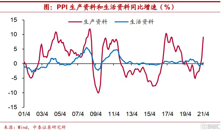 两类资料行业传导受阻。但提供生产资料的行业和生活资料行业之间,价格传导受阻,这也使得PPI增速的走高难以显著反映到CPI增速上来。如今年4月生产资料PPI同比增速已超过9%,而生活资料PPI同比还不足0.5%,上一轮PPI上行时期情况也基本类似,生产资料PPI同比增速由2016年9月的0.1%提高到2017年2月的10.4%,而同期生活资料PPI同比增速仅由0%升至0.8%。