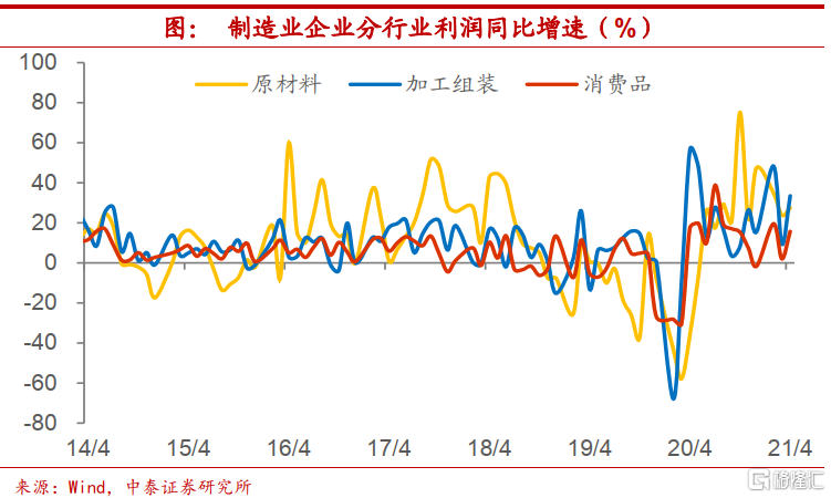 上游利润增速领跑。而从企业盈利来看待权益市场。首先,在今年上半年PPI增速上行期,上游原材料类行业利润随PPI同步改善,其利润增速将明显快于偏中下游的加工组装类和消费品制造类行业利润增速水平。