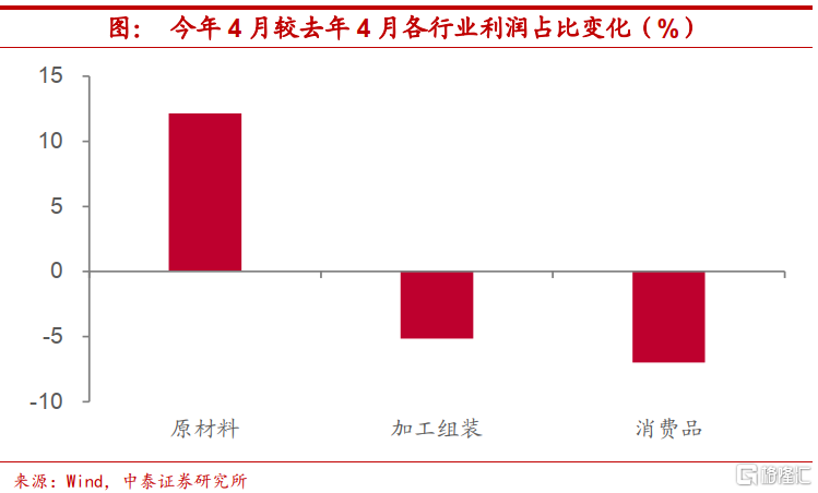 价格涨幅回落,上游盈利承压。从各行业利润占比上来看,上游行业较快的利润增速无疑会对中下游行业盈利形成挤压。相较于去年4月PPI增速仍处于底部时,今年4月PPI增速已然高企,而今年4月相较于去年4月而言,上游原材料类制造业利润占比显著提升12个百分点,与此同时,加工组装类和消费品行业利润占比分别下降5个百分点和7个百分点。但伴随着PPI同比增速的见顶回落,上游行业利润增长或将承压。