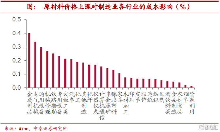 中游成本压力较大。其次,前期原材料价格上涨无疑会使得成本增加,进而对企业利润构成侵蚀,我们从两个维度对此进行测度,一是原材料价格变动给制造业各行业带来的成本上行压力。基于2018年投入产出表数据,我们发现,大宗商品价格上涨对于中游加工组装类行业的成本影响最大,特别是电气机械、通用设备、铁路船舶和专用设备等行业,而消费品制造类行业所受到的成本压力较小。