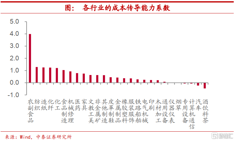 成本传导能力,中游同样偏弱。二是各行业的成本传导能力。我们构建行业成本传导能力系数来对此进行刻画,该系数越大,意味着行业成本传导能力越强。根据我们的测算,上游原材料类行业和下游消费品制造类行业中的农副食品加工、纺织、造纸以及食品制造行业的成本传导能力较强,而中游加工组装类行业和其它下游行业传导能力偏弱。