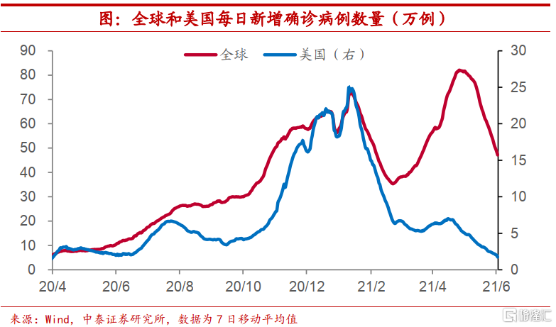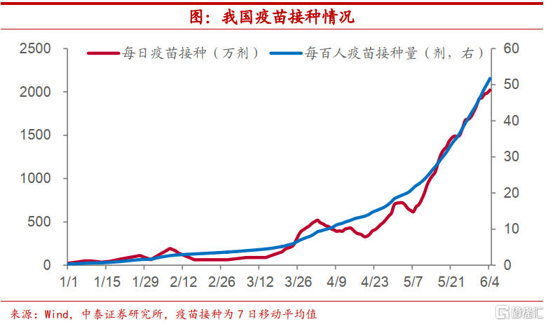 疫苗接种加速推进。另一方面,虽然我国局部地区又现疫情反复,但疫苗接种正在加速推进。我国每日疫苗接种数量从年初的23万剂次左右提高到5月底的接近2000万剂次,这也使得我国每百人疫苗接种总数超过50剂次。疫苗覆盖的提高也为疫情有效控制奠定了基础。