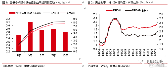 债券市场快速调整背后是资金面边际收紧。近两个工作日债券市场出现急跌,中债10年期国债到期收益率共上行5.5bp至3.11%,10年国债活跃券200016.IB收益率从3.085%上行5.5bp至3.14%,10年国债期货主力合约T2109两日累计下跌0.46%。短端利率方面,中债1年期国债到期收益率上行4.5bp至2.4116%,中债1年AAA同业存单到期收益率上行5bp至2.87%。在经济金融数据真空期,期货现货市场的连续大跌背后是资金出现收紧,跨月结束后资金利率继续回升,DR001最新收于2.31%,创2月2日以来新高;DR007则较6月3日上行22bp,20日均值虽然仍然低于政策利率2.2%,但近几日已经出现抬升迹象。