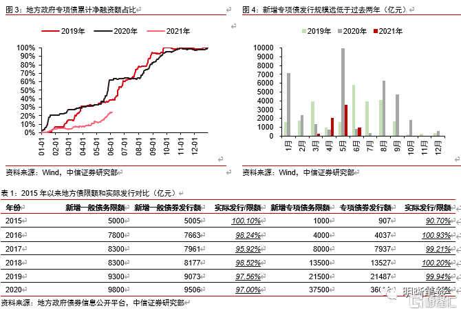 预计后续专项债供给压力将逐步增大。实际上1~5月份新增地方政府专项债共发行5726亿元,完成全年34676亿元额度的16.51%,如果假设今年实际发行95%的限额规模,若专项债仍然在10月份前完成发行,则每月需发行约5400亿元;若专项债发行持续到年底,则后续每月需发行约3900亿元,均高于5月份发行的3520亿元。专项债发行预计集中在6~9月份,且供给压力逐步增大。