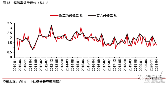 从基础货币和流动性缺口的角度测算,4月份超储率可能降至1.2%左右水平,明显低于2020年底和2021年一季度末。而根据我们的假设和测算,5月份超储率继续下行至1%上下。这也是5月末资金利率波动强于3、4月末的原因,而昨日缴准时点更显示了银行间资金面的收紧,也反映了银行超储率已经处于低位。由于6月流动性缺口较小,预计6月份超储率可能有所回升,但仍然是处于低位。低位运行的超储率使得银行间流动性环境整体处于偏紧的状态,对季节性、临时性因素的敏感度将有所提升。