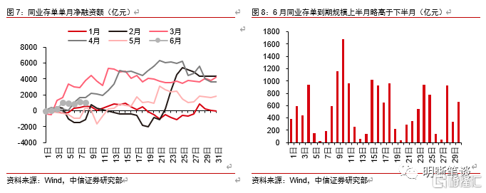 6月同业存单到期压力仍大。从同业存单到期规模上看,6月共有1.64万亿到期,与5月份到期量基本接近,全年来看仅低于3月和4月到期量,因而同业存单续作压力仍在。从月内到期节奏上看,上半月到期压力略高于下半月。在地方债发行有所加速、财政支出尚未下达的时间差内,上半月同业存单到期压力可能加大银行间资金面的波动性。