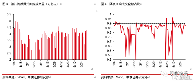 回购交易市场的结构显示当前债市杠杆并没有非常明显,但是也接近警惕红线。近两日隔夜质押式回购利率与7天质押式回购利率倒挂,反映了隔夜资金需求大、供给少。从历史上看,隔夜利率和7天利率倒挂后资金面都将面临收紧。但从隔夜回购占比看,当前隔夜回购成交量占比在88%左右,并未触及90%警戒线;从质押式回购成交金额看,6月份以来质押式回购成交金额快速回升至4万亿以上,6月3日已经非常接近4.5万亿警戒红线。近两日质押式回购成交金额有所下滑,但仍然需要警惕质押式回购成交量接近警戒线时市场波动的加大。