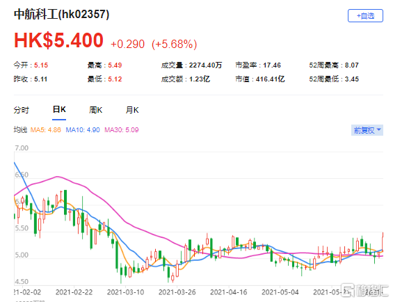 瑞银:上调中航科工(2357.HK)目标价至7.1港元 评级“买入”