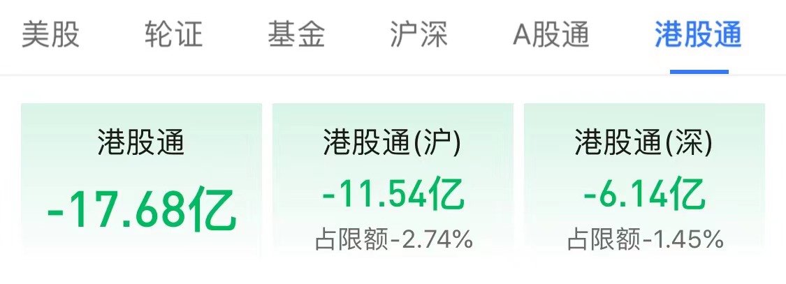 港股通方面,南向资金净卖出17.68亿港元,其中,港股通(沪)净卖出11.54亿港元,港股通(深)净卖出6.14亿港元。