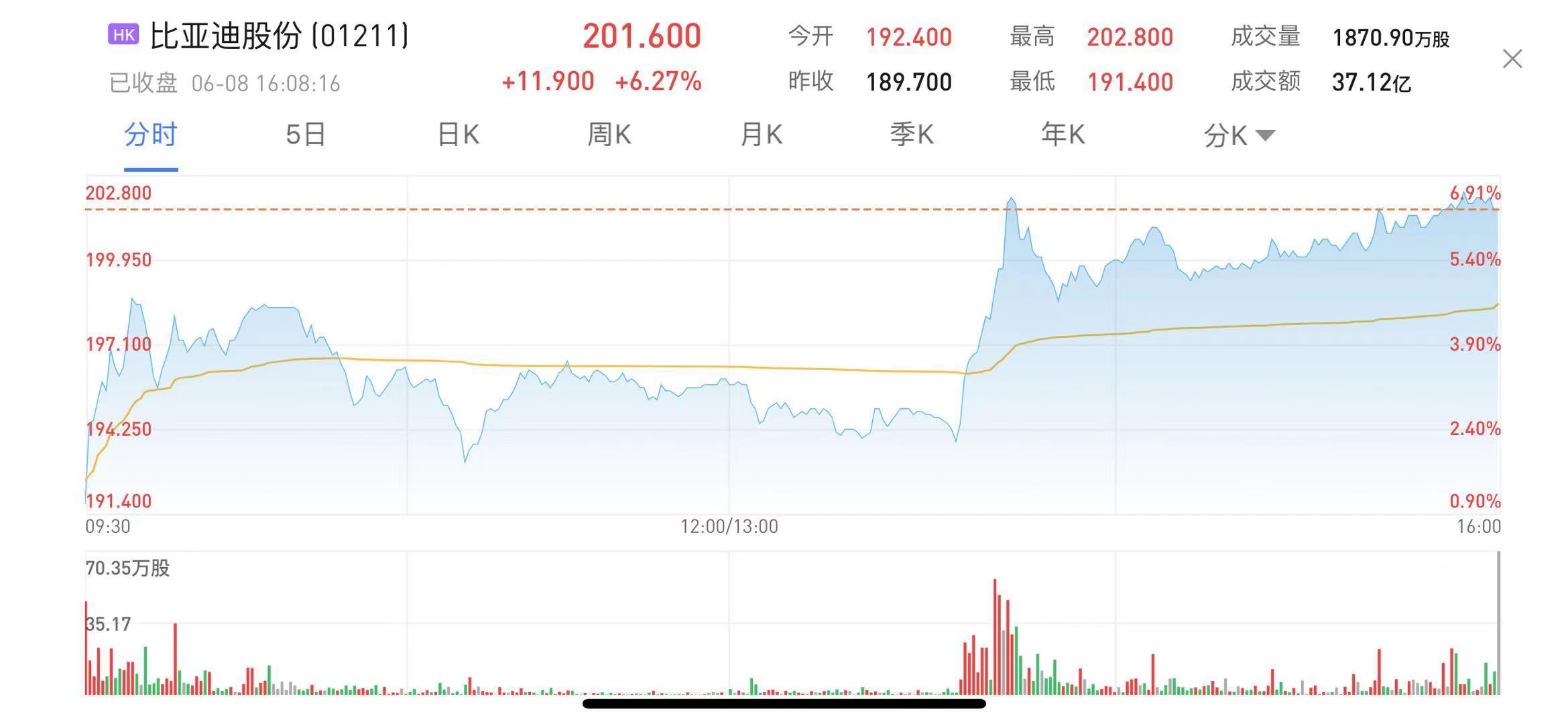 比亚迪涨超6%报201.6港元,最新市值超5768亿港元。