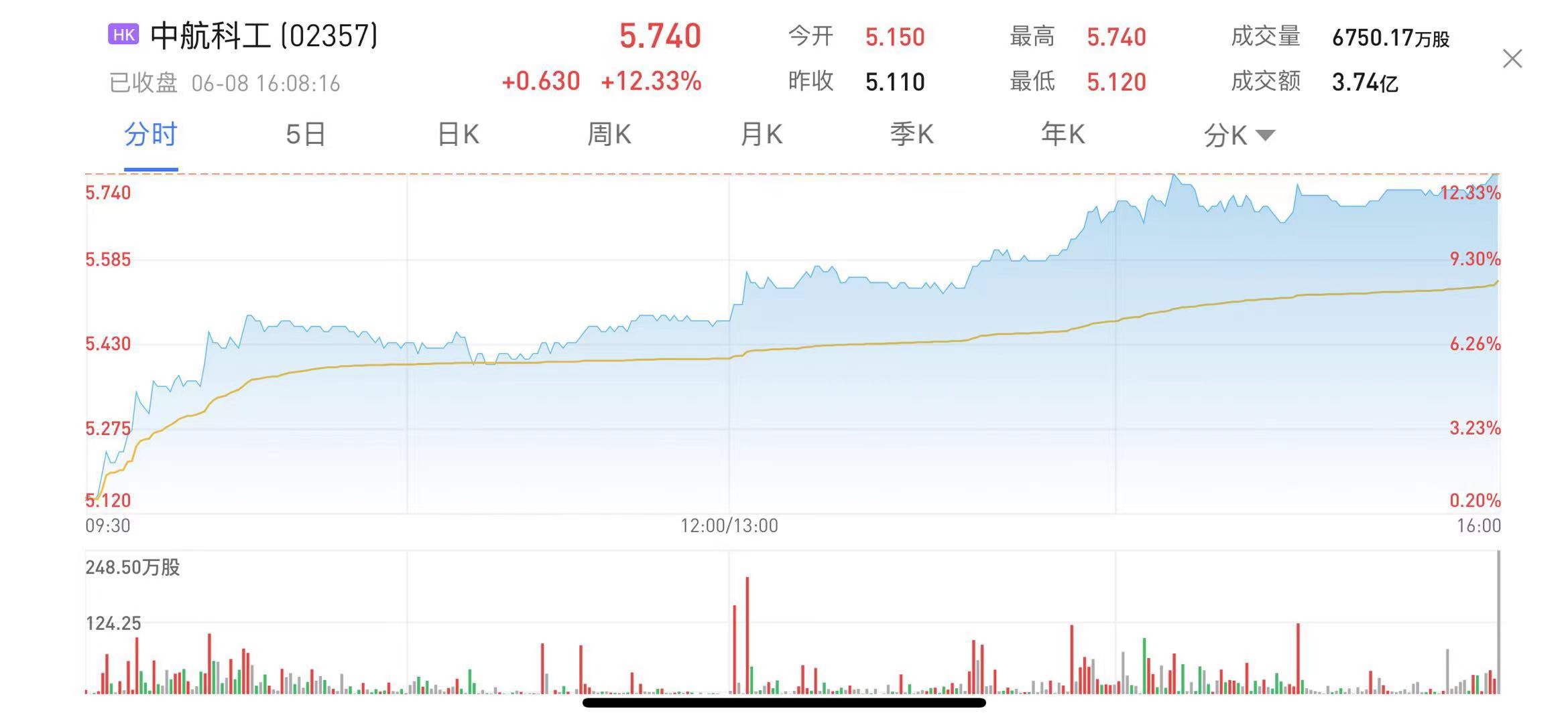 中航科工涨12.33%报5.74港元,总市值达442.63亿港元。