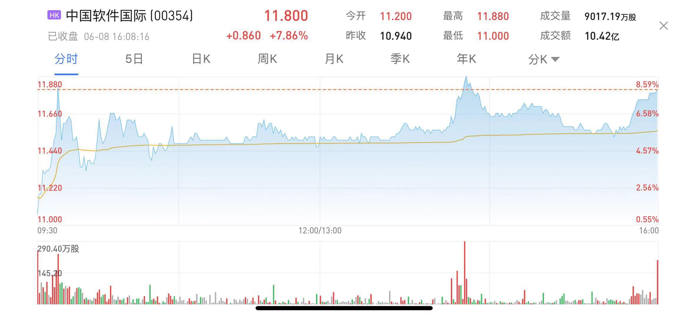 中软国际涨7.86%,报11.8港元,高见11.86港元创历史新高。