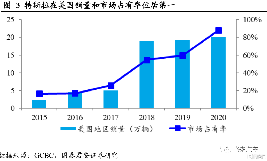 特斯拉占据美国最主要的新能源汽车市场份额。2020年特斯拉在美国销售约20万辆,市场份额达到87.92%。特斯拉目前在售的四款车型均占据了2020年美国电动车销量排行前5名,一直霸榜美国电动车单车型销量排行榜前列。
