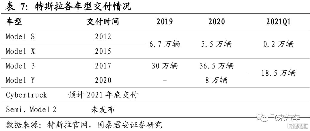 特斯拉新车型持续拉动需求增长。Model 3 和Model Y在同级别车型中处于绝对优势地位,尽管2020年开始特斯拉不再获得美国7500美元每辆车的补贴,但两车型全年仍销售共44.5万辆,产能基本全部利用。考虑美国汽车消费特色,皮卡长期占据美国车型销量榜首,尤其是大排量全尺寸皮卡。特斯拉新车型Cybertruck已经开始预订预计2021年内交付,产能充足的情况下,Cybertruck将给特斯拉带来新的增长机遇。根据特斯拉公布消息,未来规划车型还有:new Tesla Roadster、商用电动汽车(牵引车)Semi、搭载完整自动驾驶功能但定价更低的车型(Model 2)