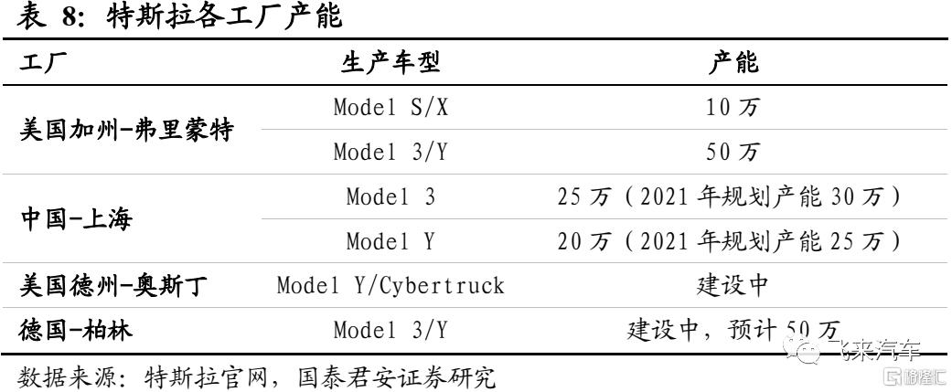 特斯拉目前已实现年产能共105万辆,美国德州和德国柏林的超级工厂预计在年内投产,扩充Model 3/Y的产能同时开始新车型量产,预计到2021年底特斯拉总产能可达165万辆。
