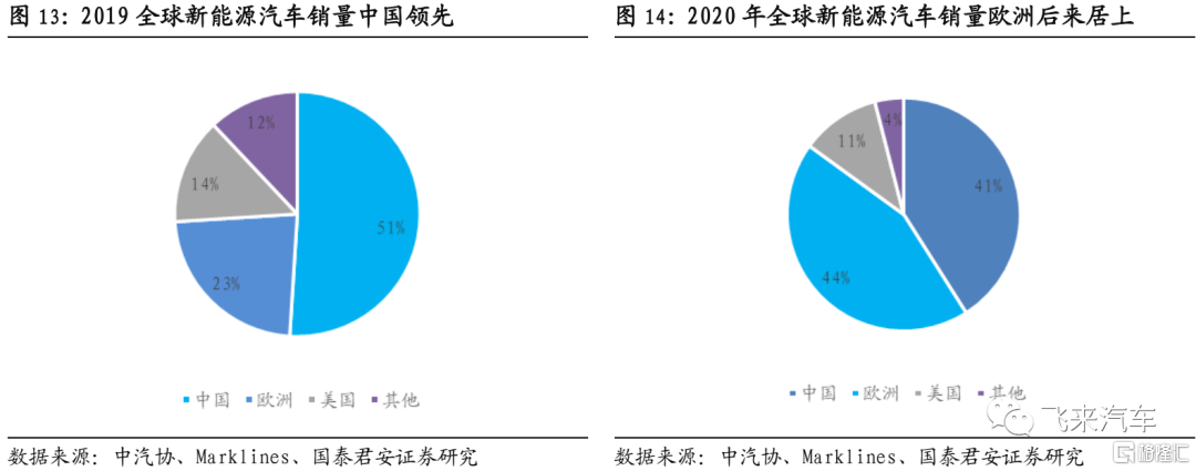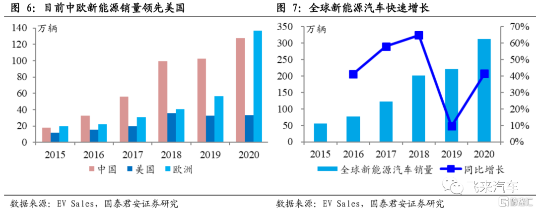 中、欧占据全球新能源主要市场,美国短期落后。2020年全球共销售新能源汽车312万辆,其中中国美国和欧洲共销售297万辆,占全球市场95%。欧洲市场在2020年迅速增长全年销售新能源汽车136.7万辆,超过中国的127万辆成为全球销量最多地区。美国受特朗普政府对新能源政策削弱和疫情影响,在2019年和2020年新能源汽车销量出现下降。