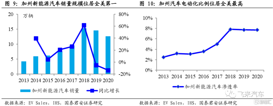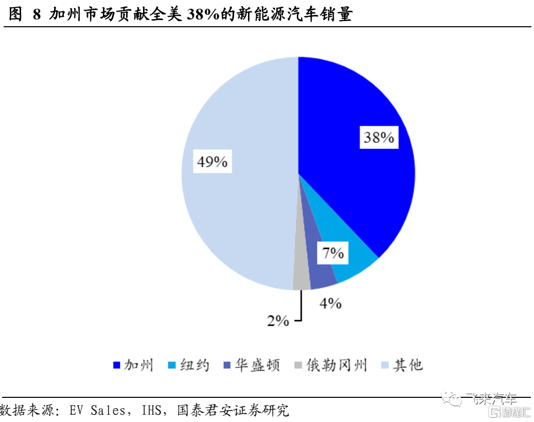 加州市场占据美国最大的电动车市场份额,汽车电动化比例也遥遥领先美国其他各州,主要得益于积极的新能源汽车支持政策推动。2020年加州销售新能源汽车12.6万辆,占美国新能源汽车销量的38%,新能源汽车渗透率为7.7%,销售规模和电动化率均远高于美国其他各州。加州新能源汽车市场生机勃勃,主要得益于长期以来积极的政策引导。加州是最早创新设计并实施新能源汽车积分交易的地区,加州1990年开始实施“零排放车辆计划”,该计划包括《零排放车辆法案》(ZEV法案)和一系列的政策和激励措施,ZEV法案创新性设计了新能源汽车的积分及积分交易制度,规定在加州销售达到一定数量的汽车品牌厂商,必须具备一定的新能源积分,积分可累计、可交易,不满足条件的需要缴纳罚金,从供给端倒逼汽车企业生产、销售新能源汽车。另外,加州实施“清洁车辆补贴项目”,通过补贴的形式从需求端提高消费者购车积极性,加州消费者在购买新能源汽车时最高可获7000美元的补贴。