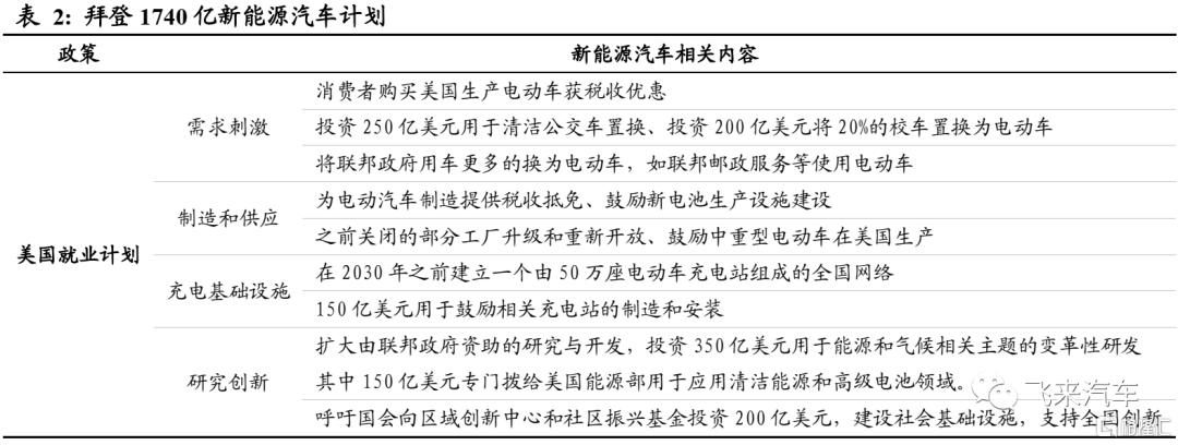 拜登政府带来新能源政策强周期。拜登在上任第一天即宣布重新加入《巴黎协定》, 2020年3月31日,拜登政府宣布了两万亿美元的“美国就业计划”,涉及到新能源的直接投资为3270亿美元,包括了:1740亿新能源汽车计划、460亿联邦清洁能源采购计划、520亿重点支持农业制造和清洁能源以及500亿支持应对气候危机相关技术研究。其中1740亿美元新能源汽车投资计划包括了新能源汽车税收减免、将20%校车置换为新能源汽车、联邦政府用车更换为新能源汽车、建立50万座充电桩组成的全国网络等。
