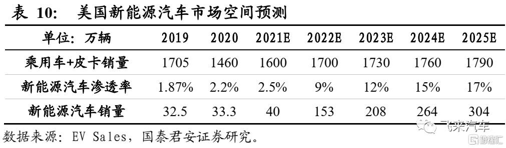 政策+供给双驱动,美国新能源汽车放量在即, 2025年有望超300万辆。美国从2015-2019年连续五年皮卡和乘用车年销量稳定在1700万辆以上,2020因为疫情下降到1460万辆,预计2021年开始逐步恢复,总销量恢复到1600万辆,到2025年增长至1790万辆。随着拜登政府对新能源汽车政策不断加码,将极大的加快电动化进程,预计电动车渗透率会迅速增长,到2025年可达17%,因此对应2025年预计美国新能源汽车销量可达304万辆。